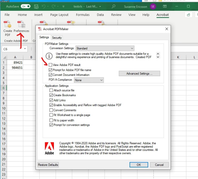 When converting Word or Excel Documents to PDF by default it opens the saved document in Adobe Reader or Acrobat.To change this behaving you need to unselect View results when Saving as PDF.This can be set permanently by opening the Acrobat Menu in the toolbar ribbon and selecting Preferences and unchecking it here. Check it to re-enable it
